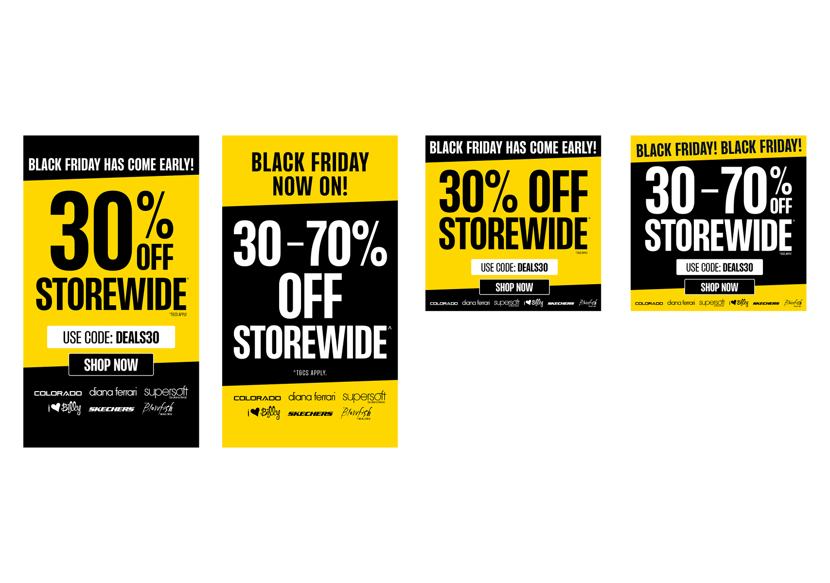 A campaign created to promote Williams Shoes’ Black Friday Sale. Designs include a homepage take over of the Williams Shoes website, eDMs, and social media posts and stories.